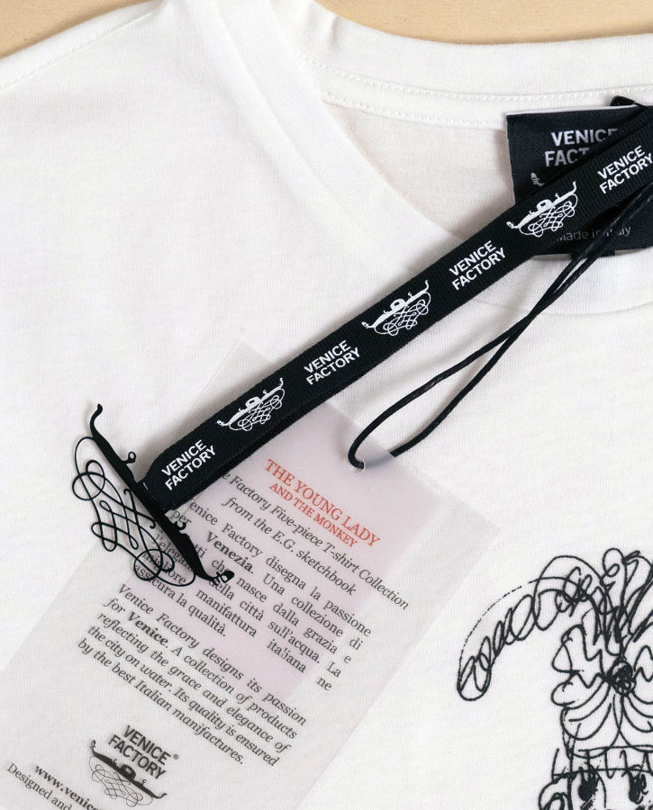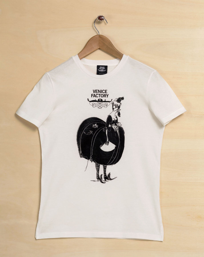 An ambitious Lady with a fan, the Basilica di San Marco and a gondola are floating on her skirt. She’s the symbol of the Venice Factory. Silk-screen printing in 1 color.